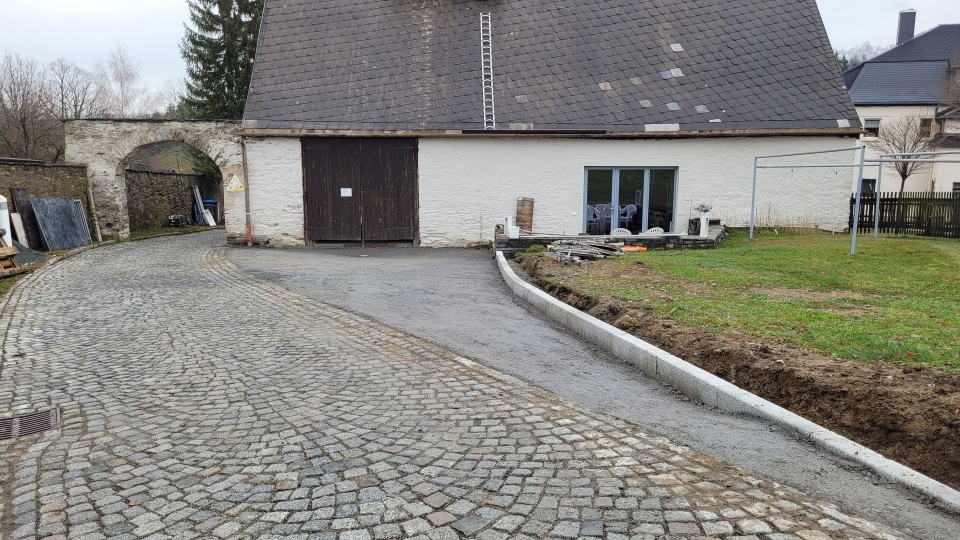 Die Zufahrt zur Pfarrscheune wurde nun winterfest gemacht. Es konnte durch das wärmere Wetter der letzten Tage noch etwas weitergebaut werden, auch wenn die Asphaltierung aufgrund der Wetterbedingungen leider nicht mehr möglich ist.