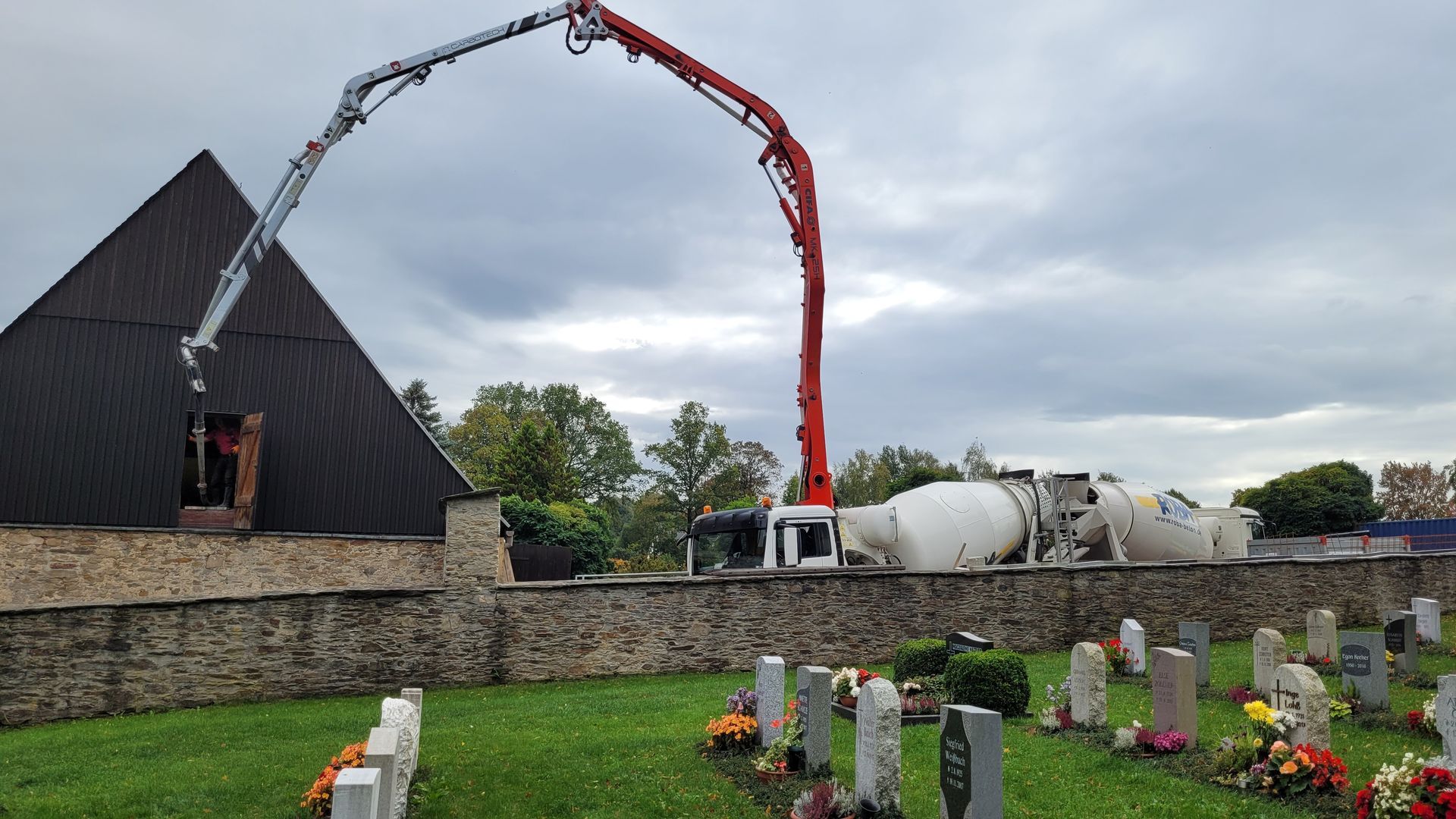 Mitte Oktober wurde die Decke in der Scheune betoniert. Alle Betonarbeiten sind damit abgeschlossen. Die Ziegelmauern können jetzt geputzt und dann gemalt werden. Dann kann die Montage der Heizung beginnen. Geliefert wurde sie bereits und wird zurzeit eingelagert, bis die Rohbauarbeiten abgeschlossen sind.