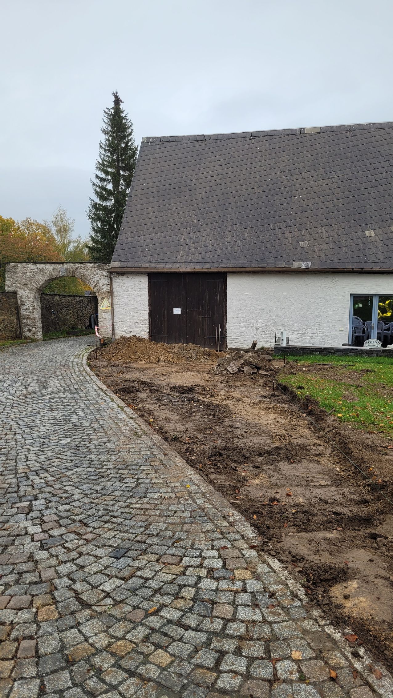 Es wurden viele Eigenleistungen erbracht, wie zum Beispiel Gräben, Pflasterarbeiten usw. Aktuell wird die Einfahrt zur Scheune für die Anlieferung der Biomasse vorbereitet. Dort müssen dann, auch im Winter, die Laster die Ladung einfach abladen können.