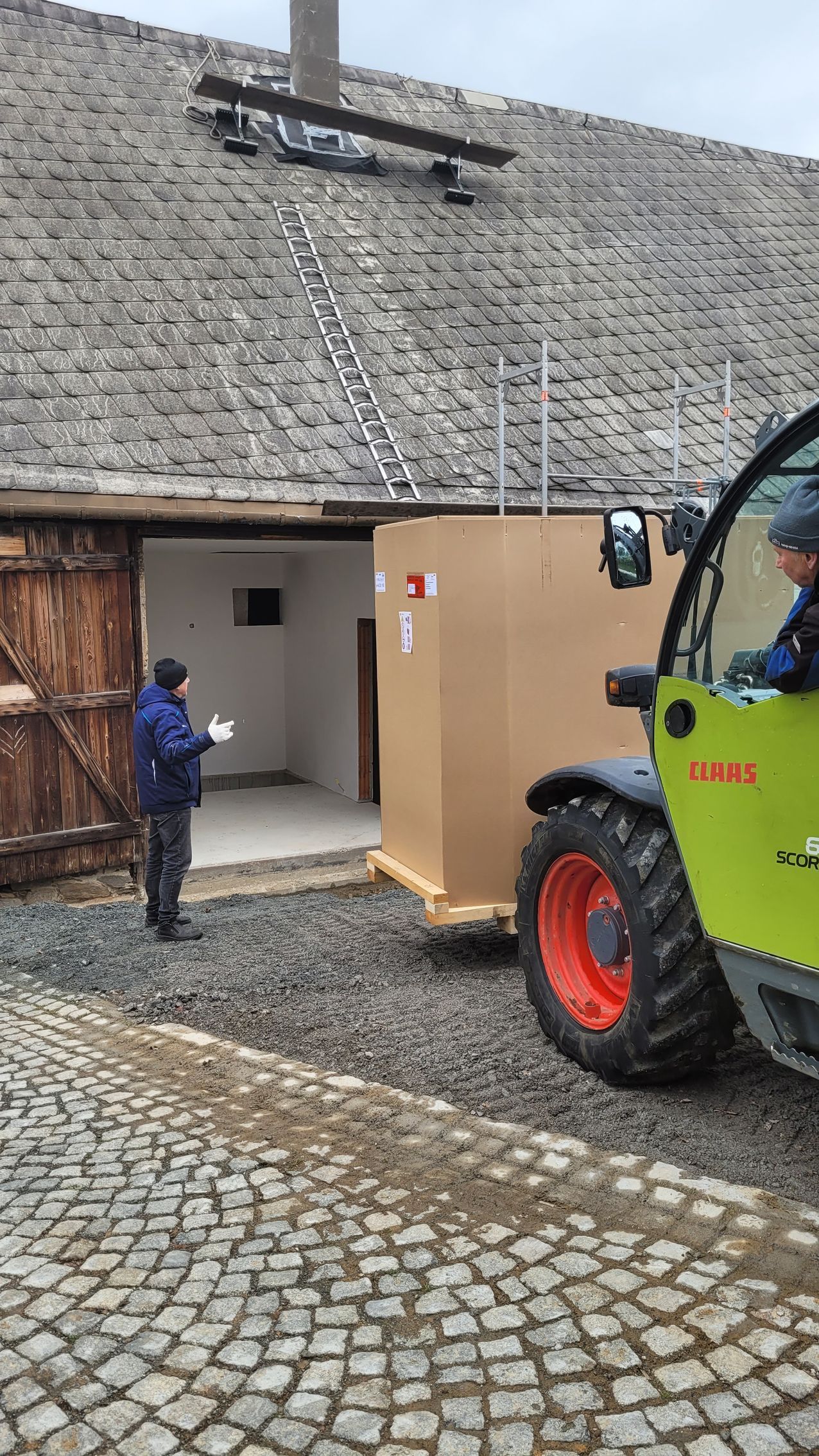 Mitte November ist nun endlich die Heiztechnik für unsere Hackschnitzelheizung geliefert worden. Heizkessel, Förderschnecke und vieles mehr hat seinen Weg in die neuen Räume in der Pfarrscheune gefunden. Im Moment wird die neue Technik verbaut und installiert.
